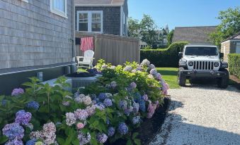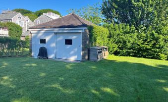 The Front house has Nantucket Grey cardboard, white corner boards with a black door, and roses climbing both sides of the handmade cedar trellis. The front and side gardens are full of hydrangeas, roses, and other surprises that pop up throughout the growing season. The lock box is on the backside of the house - Walk down either side of the house to the grassed area with the four Adirondack chairs, picnic table, and grill. The landing with two steps is tucked between both houses, with the lockbox on the left side. The first door is unlocked and opens to the 'hallway of doors.' Your kitchen door is to the right and is lockable. You can also drive and park down the shelled driveway and enter this way. It is just a tight corner so the front door will be smoother with big suitcases.