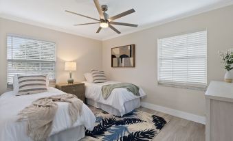 Guests are able to sleep in 5 bedrooms as well as the office with a luxurious designer pull out sofa. On the main floor, there are 3 en-suites with King Size Beds, each boosting their own 55 inch Samsung 4k HD Smart TV, an additional room with 2 Twin Beds, and a private office that can be converted to another bedroom with an exquisite designer sofa bed. There is an additional full bath on the main level. There is an additional en-suite with Queen bed off the pool lanai.