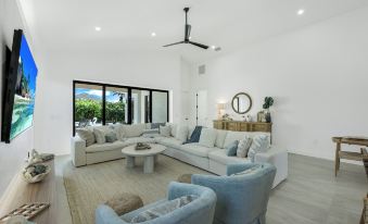 Step into a bright, open-concept living area filled with natural light from large windows that overlook the private pool and spa. With professionally designed interiors, high ceilings, and upscale finishes, Gulf Haven Hideaway offers a relaxed yet elegant setting for your stay. The seamless flow from the living room to the outdoor lanai creates the perfect space for entertaining and relaxation.