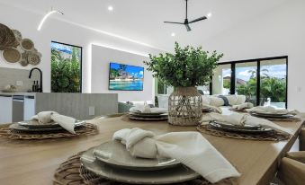 Dining Table: Seats up to 8 guests.