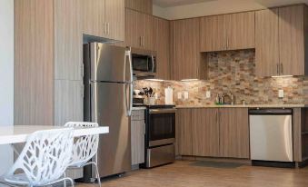Welcome to our modern rental featuring a spacious dining area with a 7-foot gloss white table and a fully equipped kitchen for your culinary needs. The master bedroom offers a full bathroom including a washer and dryer for added convenience.
