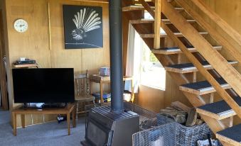The cosy, comfortable lounge and dining area is gets all day sunlight and has both a woodburner and a heatpump (with air conditioning). The Smart TV has Netflix and Chromecast etc, the Wifi is on fibre, and there's an arcade gaming machine that's loaded with over 1,000 games.