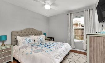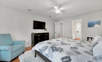 With three bedrooms and two full baths, this house is perfect for up to 7 guests! The master bedroom located on one side of the house has a king bed, (crib if needed) smart TV, and a master bathroom with a double vanity and shower/tub combo. The two other bedrooms are on the opposite side of the house. Bedroom one has a queen size trundle bed with one twin mattress, smart TV and closet. Bedroom two has another queen bed with a smart TV and closet.