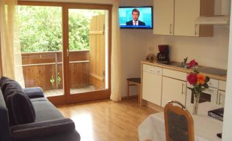 The self-catering apartments in Alpine style come with a balcony with mountain views, wooden floors, and a living area with a fully equipped kitchenette. Linen and towels are included.