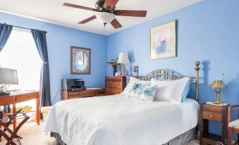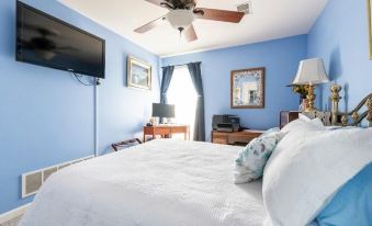 The Large Blue Guest Room has a Queen Size Bed, with antique Waterfall furniture including a dresser, nightstand, make-up desk, and work desk. There is a beautiful Brass headboard and Q/S Bed with, table lights on each side of the bed and a combination overhead Fan and light with dimmer capabilities The closet has some available room for hanging clothing, and there are room darkening shades, and an overhead combination ceiling fan and light with dimming capabilities A large Smart TV is Wall mounted and there is a desk with printer and computer monitor in the corner of this room, along with some office necessities.