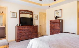The Oversized Primary Bedroom has an extra-long K/S (Sterns & Foster) Bed, and Room Darkening Shades and Drapes there is an Ensuite full Bathroom with a Rainfall Shower Fixture, plus a Walk-in Closet and plenty of storage and dresser space. It has a beautiful Tray Ceiling with an overhead light & fan with a dimmer switch. There are bedside lamps and a room lamp all of which have diming devices. There is also a Large SMART TV.
