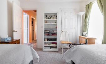 The 3rd bedroom Green & White has Two (2) Brand New Extra Long, top-of-line Beauty Rest Mattresses, Room Darkening Shades & Curtains, a table lamp, and an overhead Light and Fan with a dimmable feature. with some closet storage, luggage racks, and a small dresser/cabinet.