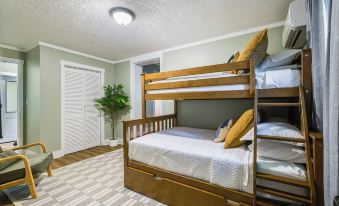 The dedicated game room is a favorite for kids and kids-at-heart, featuring a Nintendo Switch, Xbox, and a retro arcade for hours of entertainment. Four well-appointed bedrooms—including a bunk room—offer plenty of space for families and groups.