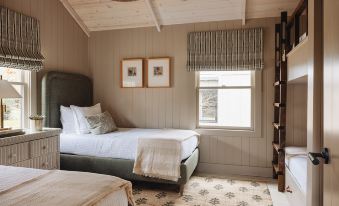 While The Townie Cottages is a community development of 4 cottages, each unit is its own separate building and private space. Upon entering The Moss, guests will find the 2-bedroom, 1-bath residence with a welcoming open floor plan showcasing the exquisite palette of Kate Marker’s furnishings, which provide the utmost in cottage luxury. The living area has a sofa with additional side chairs that face the gas log fireplace. Directly behind the living area is the kitchen, featuring a large island with seating. A stack washer/dryer is tucked away in a closet. There is one bathroom located off the main living space, which has a large walk-in shower and a double vanity. The primary bedroom has a queen bed. The large secondary bedroom consists of twin-over-twin bunk beds and 2 additional single beds.