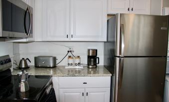 Free off street parking, and a VERY well stocked kitchen will make your stay easy and comfortable.