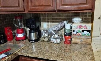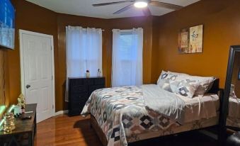 Fully renovated apartment with new kitchen and appliances; modern and cozy furniture throughout. The entrance to the apartment is on the second floor. The main common area, the living room, has an easy-to-connect-to projector that guests can use for entertainment purposes. Along with 2 pull-out couches. All bedrooms have a Roku TV and a remote-controlled ceiling fan with an LED-changing light bulb. There is an accessible washer and dryer in the master bathroom.