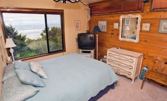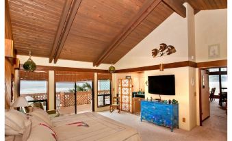 This 2,100sf contemporary oceanfront home is beautifully appointed to maximize both comfort & views. The living, dining & kitchen areas are on the upper level adjacent to an oceanfront sundeck, and many large picture windows take in the views. A high vaulted open beam ceiling & floor to beam rock fireplace accentuate the open yet cozy expanse, with a 52" LCD TV/DVD & free WIFI internet.