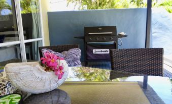 BBQ and outdoor dining table on the deck facing the pool and lagoon and there are sun loungers and cod chairs. Grab a snorkel mask and pipe or a paddle board off the deck and head down the lawn to the beach and lagoon.