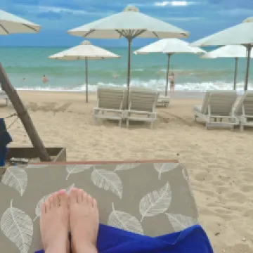 Об отеле: расположение отличное, подальше от центра и суеты, спокойно, народу меньше, безопаснее. Но, надеяться на бесплатные лежаки не стоит, их от отеля всего 9 с зонтиками. Ни разу не удалось урвать, всегда все уже было занято. Покупали за 150 донгов на целый день у соседа)))