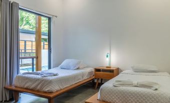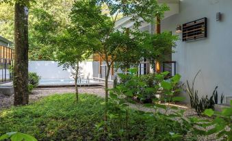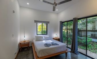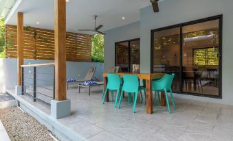 A modern and clean design is featured throughout the house, making each and every room feel airy and spacious. Rooms provide jungle views (one king, one queen and two singles) and are equipped with modern furnishings and independent A/C units. The living space holds the TV area and an open plan fully-equipped kitchen. In the backyard guests will find the pool as well as a beautiful outdoor dining area. There is a private property guard on watch from 5-10 pm every day.