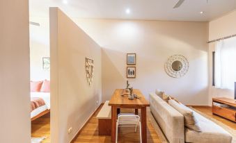Our Apartments are fully furnished and have brand-new construction. They are equipped with a full kitchen and cooking utensils. They are very conveniently located in central Guiones. They are very comfortable for a couple with a child or two people. They are equipped with a queen bed and a futon couch that can be converted into a bed for additional guests.