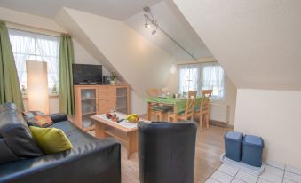 Apartment house. In the centre of Norddeich, 1.2 km from the sea, 1.2 km from the beach. In the house: central heating system. Parking at the house. Supermarket 300 m, restaurant, bakery 350 m, café 700 m, bus stop 250 m, railway station 1.4 km, ferry 1.4 km, sandy beach 1.2 km, outdoor swimming pool 14 km, indoor swimming pool 1 km. Golf course (18 hole) 8 km, surf school 1.2 km, tennis 2 km, minigolf 1 km. "Sandburg", 2-room apartment 40 m2, on the upper floor. Object suitable for 2 adults + 2 children. Beautiful and tasteful furnishings: living/dining room 14 m2 with 1 double sofabed (160 cm, length 200 cm), cable TV (flat screen), hi-fi system and DVD. 1 room 12 m2 with 1 double bed (2 x 90 cm, length 200 cm). Kitchenette (4 ceramic glass hob hotplates, toaster, kettle, electric coffee machine, combination microwave). Shower/WC. Facilities: children's high chair (extra). Internet (WiFi, free). Please note: fridge without freezer, non-smokers only. Smoke alarm.