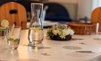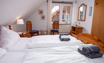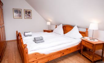 Beautiful semi-detached house "Siegerland". In the resort, in a quiet position, 1.5 km from the sea, 1.5 km from the beach. Private: large garden with lawn and flowers. In the house: central heating system. Parking at the house. Supermarket 900 m, restaurant 1 km, bakery 600 m, café 1 km, bus stop 600 m, railway station 2 km, ferry 2 km, sandy beach 1.5 km, outdoor swimming pool 14 km, indoor swimming pool 900 m. Golf course (18 hole) 8 km, minigolf 900 m. 3-room semi-detached house 74 m2 on 2 levels, on the ground floor. Beautiful and cosy furnishings: living/dining room with satellite TV (flat screen), radio. Exit to the terrace. Open kitchen (4 hot plates, oven, dishwasher, toaster, kettle, microwave, electric coffee machine). Sep. WC. Upper floor: 1 room with sloping ceilings with 1 double bed (2 x 90 cm, length 200 cm). 1 room with sloping ceilings with 2 beds (90 cm, length 200 cm). Shower/WC. Terrace furniture. Facilities: washing machine, dryer, children's high chair. Internet (WiFi, free). Please note: non-smoking house. Smoke alarm.