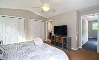 The first floor has an open floor plan with a fully equipped eat-in kitchen with gas stove. Basic pantry items like coffee & tea are stocked. The living room features 55 inch HDTV & comfortable couches. There is an entryway sitting area & workspace. A half-bath is located on the main floor. In the large yard, you will find an outdoor dining area, propane grill, and swingset. Moving up to the second floor, there are 3 bedrooms with 1 king and 2 queen beds total & and luxurious bedding. The master bedroom has vaulted ceilings and an en-suite full bathroom with a tub. Central air throughout & ceiling fans. A full bathroom with tub is located in the hallway. Room darkening shades in all rooms as well as ceiling fans & central air.