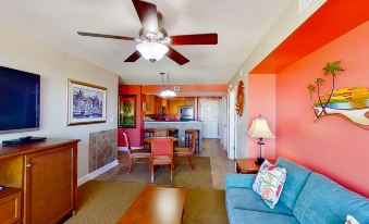 This family-friendly condo offers partial ocean and beach views, and a private balcony! Wake up to the delicious smell of scrambled eggs prepared by one of your friends in the fully-equipped kitchen; nothing beats a savory breakfast to hit the beach fully energized. Spend fun afternoons at home watching TV on the large flatscreen TV, or you might as well enjoy a refreshing splash in the shared outdoor pool, or a soothing bath in the shared hot tub.