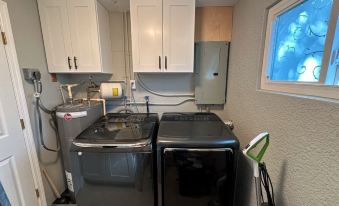 • Fully Equipped Kitchen: The kitchen is stocked with everything you need to cook and entertain, including a coffee bar to start your mornings right and an array of cookware, including a blender, a small air fryer, and a toaster to help you prepare delicious meals. Whether you're whipping up a simple breakfast or hosting a family dinner, you'll find everything you need for a seamless cooking experience. Kitchen bar that seats 3 people, along with a dining room table that seats 6 people.
