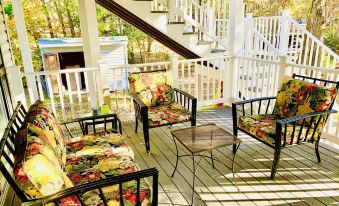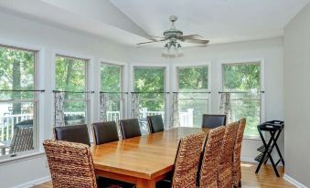 The spacious family room offers comfortable seating and a large 55” TV.. The family room and kitchen open out to the huge upper deck with lots of comfortable seating and great views of the lake and backyard! On this one deck alone, there are three seating areas: sink into the comfortable chairs in the covered deck area with ceiling fan, do some bird watching from the rocking chairs under the canopy of the trees, or enjoy a meal on the small outdoor table! We regularly see a pair of bald eagles and flying squirrels from the back deck; it's incredible! There is also a lower deck that offers another great area for enjoying the beautiful outdoors with additional comfortable patio seating, providing you with multiple areas to spend time with your family and friends.