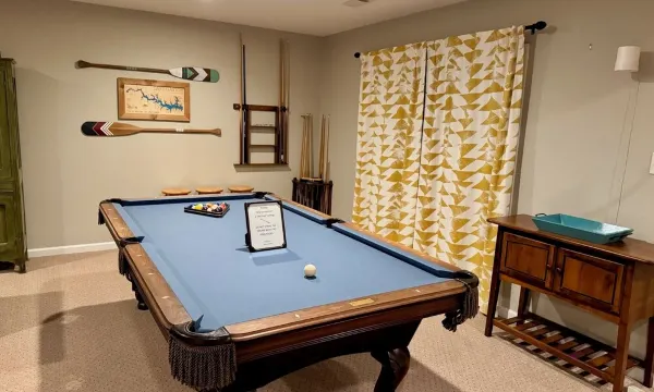 LOWER LEVEL: The lower level is stocked with entertainment. There is an 8’ Olhausen pool table, a foosball table, tons of games and puzzles, a large TV for movies or watching the game, and multiple areas for relaxing. The lower level has two bedrooms: one with a king-sized bed and the other with two bunk beds (one double and three twins); there is also a pull out sofa in the main area. There is a full bath with a tub/shower combination. There is also a laundry room on this level with a full-sized washer and dryer for your use.