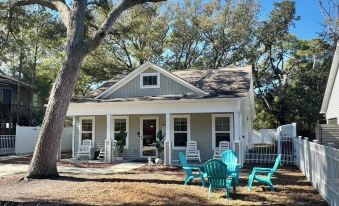 NO PET FEES, FENCED YARD! This modern & luxurious dog-friendly, 3 bed, 2 bath home is close to the beach! This home sleeps 8, perfect for 2 families. Open concept living/dining/kitchen is perfect for family time. Enjoy the evening on the screened porch or sip your coffee on the rockers on the front porch. Fully stocked kitchen for cooking all your meals. The dogs and kids have room to play in the fenced backyard. Spotless and comfortable - this home has everything! Linens included & beds made.