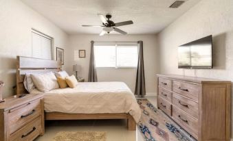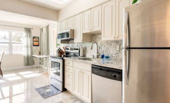 Tammy's rental house is a sweet 2 bedroom 2 bath, with a contemporary kitchen/ dining area, just right for making breakfast or dinner. There are large TVs in each room and one on the back porch. It's clean, light, and airy with shiny quartz tile floors.