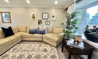 -Bright Living & Dining room with large windows and comfortable sectional sofa.