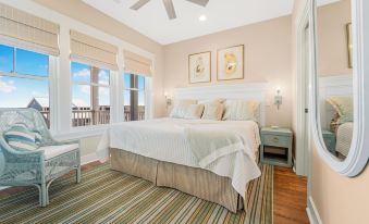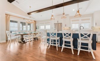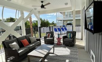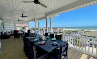 The 4th (top) floor hosts the main living room with ample comfortable seating, an 85-inch Sony UHD 4K TV and a bar area with a wine refrigerator. The kitchen and dining area is located on the top floor, with a dining table that seats 10 and bar seating for 9 more. The top floor also contains a king bedroom with private bath, as well as a full-size laundry room with a second refrigerator, washer and dryer and an ice maker that stores 25 pounds of fresh ice. The 4th floor deck has an outdoor dining table, ceiling fans and plenty of comfortable seating for taking in the stunning ocean views.