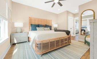 On the 3rd floor (middle) you will find a second large living room, a king bedroom with private bath, and another king bedroom that shares a Jack-n-Jill bath with the bunkroom. Each side of the Jack-n-Jill has its own sink and toilet, connected by a shared shower/tub combo. The bunkroom contains 2 full-over-full beds. The living room has a 75-inch Sony UHD 4K TV. The fabulous ocean views can be seen from the 3rd floor deck which has rocking chairs and a swinging day bed.