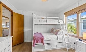 -Guest BR with Twin over double bunk bed, bathroom with shower.
