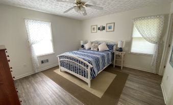 On the main level, down the hallway are the master bedroom with a king-size bed, and the McCoy bedroom with queen. Both bedrooms have their own bathroom - one with a tub and one with an easy-access shower. All bathrooms have towels, hair dryers, soap, shampoo, conditioner, and makeup removers.