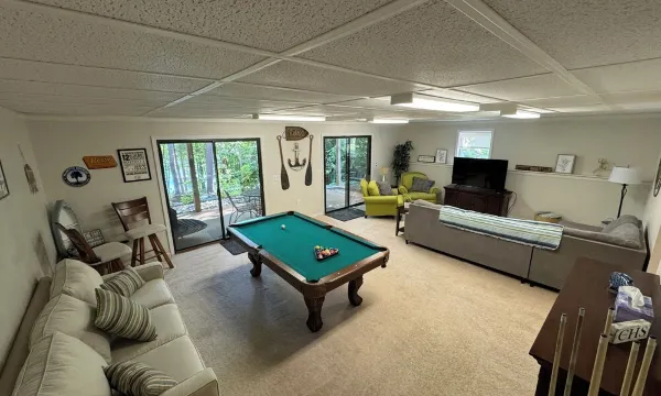 Head downstairs to the HUGE rec room. There is a pool table and bar area on one side, with comfy furniture and a 60" TV on the other. Down the hallway here, you'll find a bathroom, the Cave (queen bedroom), the Bunker (two twin bunk beds), and the laundry room. In the hall closet, you will find a pack-and-play, booster seat, first aid kit, and some lake toys.