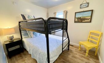 Rear Building: Open living area with Sleeper Sofa, TV, and eat-in kitchen. Two bedrooms, each with a Pyramid Bed (double on bottom and twin on top). Entry door via living area and access to shared screened porch via one bedroom. Walk-thru bathroom with tub/shower and stackable washer/dryer.