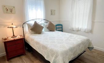 The front section of the cottage offers a large open living area with a TV, a fully equipped kitchen with a dishwasher and electric stove, one bedroom with a Queen bed and TV, and a Daybed in the alcove den. One full bath with shower. Guests will enjoy the front screened porch.