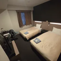 Несмотря на обычный вид из окна, расположение отеля отличное. Он находится всего в 3-4 минутах ходьбы от станции Окаяма. Рядом есть магазины Lawson и 7-Eleven, а крупный торговый центр Aeon расположен прямо через дорогу. В отеле доступна самостоятельная регистрация заезда и выезда, а также имеется общая баня. Двухместный номер с двумя отдельными кроватями (твин) оказался довольно просторным.