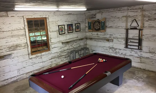 Awakening Spirit Retreat is a 3 Bedroom 2 Bath cabin that is located on 8 wooded acres that are yours to explore and hike during your stay. The cabin has a separate garage that has been closed in that is home to Awakening Spirit Massage Therapy and Hypnosis Monday through Friday. The entire cabin was originally used for the business until we closed off the garage so that we could live there during the construction of our home. Our new home is now complete and we wanted to share the simplicity and tranquility that we found while our family stayed in the cabin. The cabin has a covered front porch perfect for drinking your coffee and watching the wildlife as you wake up in the morning, an open back porch with plenty of seating, and a fire pit that is perfect for enjoying the sunset and a glass of wine. There is a game room in a separate building that has a dart board, pool table, and separate refrigerator. The cabin is equipped with a full kitchen that has most of the basic utensils you will need, and a charcoal grill on the back porch. It has a central heat and A/C unit, as well as a wood burning fireplace with wood provided. The main bedroom has a queen size bed and adjoins a full bathroom. The second bedroom has a full size bed, and the third bedroom has a queen size bed with a twin bunk above.About pets:Pets allowed.Non refundable pet-deposit of $75.00.About checkOut:Check out before 11:00 AM.About children:Children allowed: ages 0-17.About checkIn:Check in after 4:00 PM.About smoking:Smoking is not permitted.About minBookingAge:Minimum age to rent: 25.About events:No events allowed.