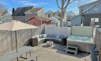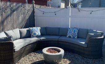 Relax in the private, fenced-in back patio complete with a large outdoor sofa, propane fire pit, grill, dining table, and hot tub where everyone can enjoy time outside together.