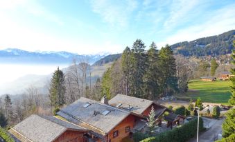 Chalet "Les Girolles", surrounded by meadows. 600 m from the centre of Villars, in a quiet, sunny position, south facing position. For shared use: indoor pool heated (11 x 4 m, depth 80 - 150 cm). In the house: sauna (extra). Lift, storage room for skis, central heating system, washing machine (extra), tumble dryer (for shared use, extra). Motor access to the house. Parking. Grocery 950 m, restaurant 950 m, bakery 850 m, 11 minute walk to the centre, bus stop 800 m, railway station "Villars-Bretaye" 800 m, indoor swimming pool 550 m, thermal baths "Lavey-les-Bains" 19 km. Sports harbour 25 km, golf course (18 hole) 7 km, indoor tennis centre 2 km, sports centre 2 km, mountain railway 800 m, gondola lift 2.3 km, ski bus stop 800 m, ski school 800 m, ice rink 550 m. Free ski bus service to the ski region Villars. Please note: Additional accommodations can be booked. "Les Girolles B14", 1-room apartment 20 m2 on 3rd floor, south facing position. Simple and beautiful furnishings: living/dining room with 1 double sofabed (140 cm, length 200 cm), satellite TV. Exit to the balcony, south facing position. Kitchenette (3 hot plates, oven, toaster, kettle, electric coffee machine, raclette grill, fondue Set (cheese)) with bar. Shower/WC. Terrace furniture. Marvellous panoramic view of the mountains and the valley. Facilities: hair dryer. Internet (WiFi, free). Parking space n 14. Please note: fridge without freezer. Maximum 1 pet/ dog allowed.
