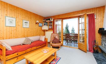 Villars: Chalet "Sapin Bleu". Above Villars, in the district of La Résidence, in a quiet, sunny position, 100 m from the skiing area, in the countryside, south facing position. In the house: sauna, lift, storage room for skis, central heating system, washing machine (extra), tumble dryer (for shared use). In Winter: please take snow chains. Public parking. Shop 2.6 km, grocery 1.3 km, restaurant 1.9 km, bakery 1.9 km, 20 minute walk to the centre, bus stop 1.9 km, railway station "Villars" 2.9 km, indoor swimming pool 2.2 km, thermal baths "Lavey-les-bains" 19 km. Sports harbour 25 km, golf course (18 hole) 8 km, indoor tennis centre 3 km, sports centre 3 km, mountain railway 2.9 km, gondola lift 1.4 km, ski bus stop 1.5 km, ski school 2.8 km, children's ski school 3 km, ice rink 2.2 km, children's playground 3.2 km. Please note: car recommended. Free ski bus service to the ski region Villars. Please note: Additional accommodations can be booked. "Sapin Bleu 6", 2-room apartment 60 m2 on 1st floor, south facing position. Beautiful and cosy furnishings: living/dining room with 1 pull-out bed (2 x 80 cm), open-hearth fireplace and satellite TV (flat screen), CD-player. Exit to the balcony. 1 room with 2 beds. Open kitchen (4 hot plates, oven, dishwasher, toaster, kettle, microwave, electric coffee machine, raclette grill, fondue Set (cheese)). Bath/WC. Small balcony 10 m2, south facing position. Very beautiful panoramic view of the mountains. Facilities: hair dryer. Internet (WiFi, free). Blu-ray player. Garage space n 6, height 200 cm, width 470 cm.