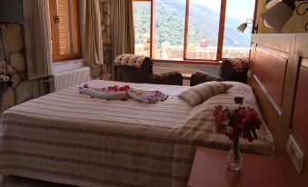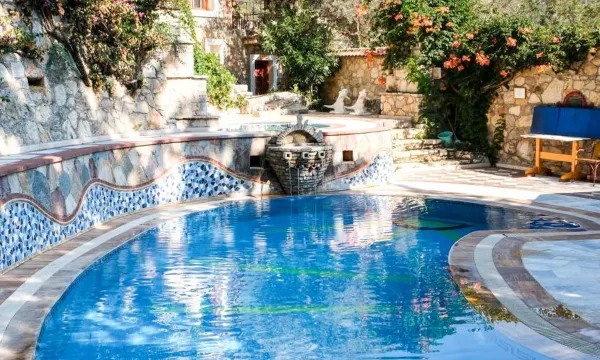 Вилла включает в себя комплекс из 6 домиков, ресторана, спа и бассейна, расположенных на склоне горы в 1,5 км от самого поселка и моря. Классная работа команды архитекторов, дизайнеров и мастеров. . Покой, жара, шелест воды и треск цикад позволяют растечься на лежаке у бассейна. ПОсле шумного Мармариса наступило отдохновение У нас была стандартная вилла; состоящая из спальни, кухни, 2 санузлов и дополнительного спального места на кухне.общее сочетание нескольких стилей, а также пейзаж за окном, создает ощущение пребывания в Испании или Португалии. У каждого номера есть свое патио со столиком на улице и сушилка. Абсолютная чистота и порядок. Полностью автономное пребывание для семьи из 3-4 человек. Теперь о дополнительных услугах: завтрак и спа процедуры. Завтрак стоит 15€ на человека в него входит: омоет, сыр, овощи, оливки, масло, мед, варенье, хлеб и чай или кофе. Традиционный турецкий вкусный завтрак. До СПА и хамама мы не дошли.Вечером попробовали зайти в ресторан покушать, но что-то не задалось и пришлось прогуляться. Прекрасное размещение для людей нуждающихся в покое или для компании из нескольких семей на несколько дней.