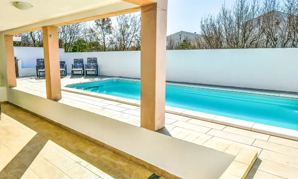 Maslenica 26 km from Zadar: Apartment house "4 you". In a sunny, elevated position, 450 m from the sea, 450 m from the beach. For shared use: property 450 m2, swimming pool (4 x 8 m, depth 150 cm, seasonal availability: 01.May. - 01.Oct.). Outdoor shower, garden furniture, barbecue. In the house: internet access, washing machine. Parking (for 2 cars) at the house on the premises. Shop 1 km, supermarket 6 km, restaurant 2 km, bus stop 2.7 km, rocky beach 130 m. 3-room house 55 m2 on 2 levels, south-west facing position. Living/dining room 35 m2 with 1 sofabed (120 cm, length 190 cm), TV and international TV channels (flat screen), air conditioning. Exit to the terrace. 1 room with 1 french bed (180 cm, length 200 cm). 1 room with 2 beds (90 cm, length 200 cm). Open kitchen (1 hot plate, oven, dishwasher, Gas stove, 3 gas rings, freezer). Shower/WC, sep. WC. Terrace 25 m2, roofed. Terrace furniture, barbecue, deck chairs (4). View of the swimming pool. Facilities: washing machine, hair dryer. Internet (WiFi, free).