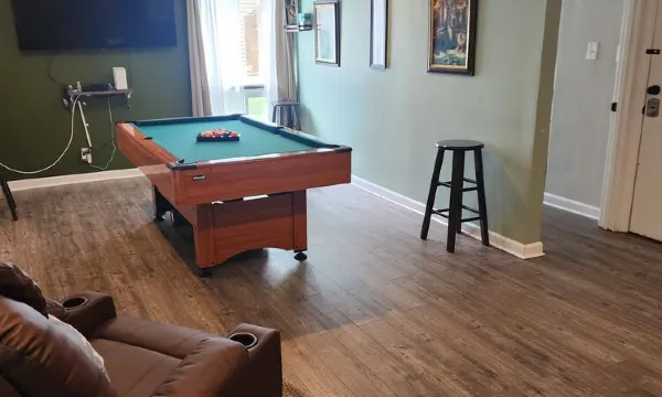 Cozy-up with your partner, family, or friends at this peaceful oasis. You'll be amazed by the clean and fully stocked home away from your home. Upon entry, a pool table awaits, with two bedrooms across the hall from each other. There is a full bathroom and kitchenette/laundry room on the entrance floor. The top floor features an executive master suite with an en suite bathroom, a pristine kitchen, dining room, and cozy living room area with a fireplace.