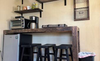 Kitchenette: This kitchenette has a mini refrigerator/freezer, countertop that doubles as an eating space, coffee maker, toaster-oven, 2-burner hot-plate, cutting board, cookware, dishes, utensils, 4 stools, paper towels, hand soap, and a trash basket. You will find coffee, creamer, and sugar to get you started in the morning.
