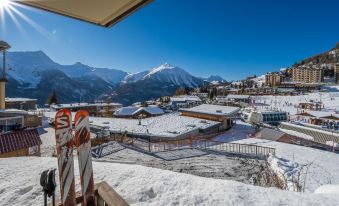 Orcières: Apartment block. 100 m from the skiing area. For shared use: swimming pool heated. In the house: lift. Supermarket 200 m. "T. Bergerie", 2-room apartment 36 m2. Object suitable for 6 adults. 1 room with 1 double bed and TV. Living room with 1 sofabed and 1 x 2 bunk beds, 1 pull-out bed. Kitchen (4 ceramic glass hob hotplates, microwave, freezer, electric coffee machine). Bath/WC, sep. WC. Terrace. View of the mountains. Facilities: Internet (WiFi, free). Parking (1 car) at the house. Please note: non-smokers only. Smoke alarm. Offer by a commercial proprietor according to Art. 155, IV, CGI