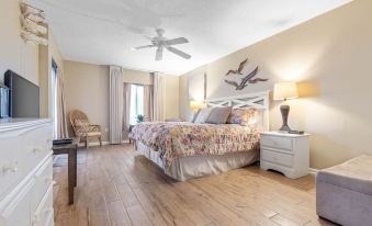 Large master bedroom with new California king bed, private bathroom, and balcony overlooking the Atlantic Ocean.