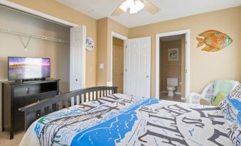 The fifth bedroom is located upstairs and has two twin sized beds, a full-size bed, dressers, and a flat screen TV. There is an attached bathroom with a stand-alone shower and a single vanity sink.