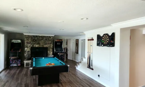 The Downstairs features the remaining two master suites as well as the kid’s bunk room. Each of these master bedrooms have doors leading directly out to the patio, hot tub, and to the lake. The bunk room is designed to sleep 5 children. It has a bunk bed with a full size mattress on the bottom and a twin mattress on top. Another full size bed completes this great kids room. Also located downstairs, and sure to include many hours of entertainment, is the spacious game room. The game room is complete with a pool table which includes a ping pong top, game/card table, darts, a wood burning fireplace, sit down bar and utility kitchen. Just off the game room is a screened in patio with lights and a ceiling fan, to enjoy all those lovely spring and summer evenings.